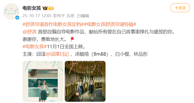 10月17日,舒淇首部自编自导电影作品《女孩》官宣定档,将于2025年11月1日全国上映。